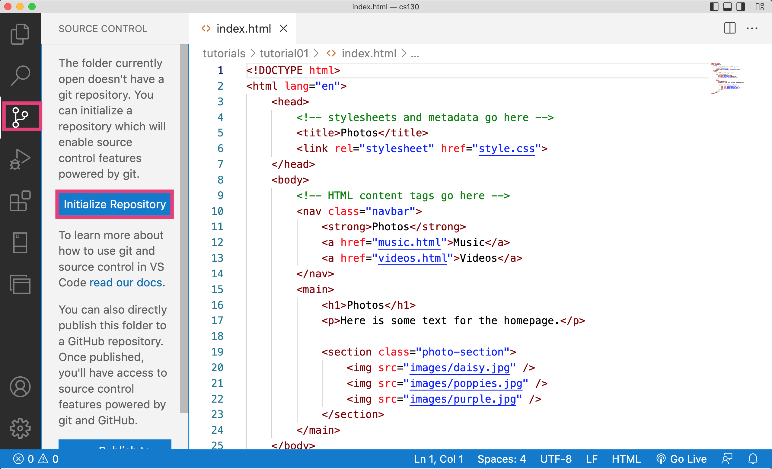 Once you've done this, click on the icon that looks like a tree branch (left-hand toolbar), and click the blue button that says "Initialize Repository":