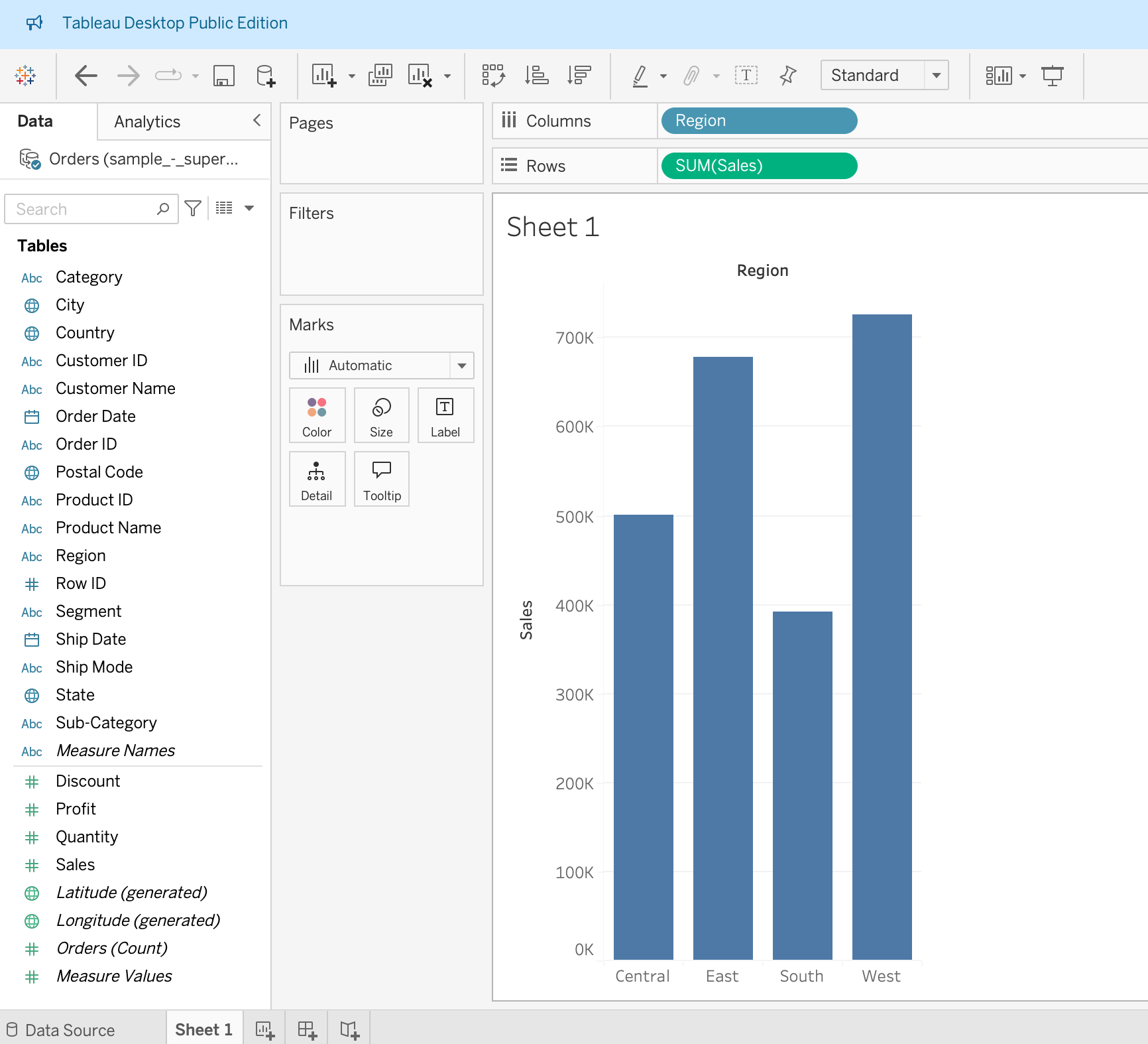 Double-click on the Sales measure and Region dimension. It should automatically create a bar chart for you: