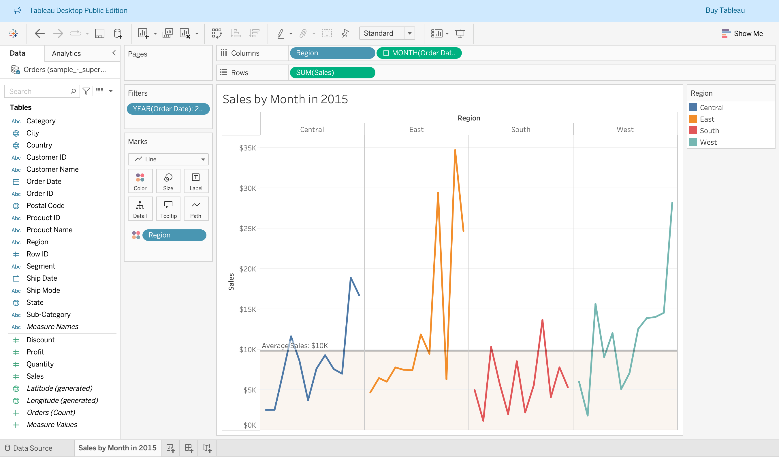 In a new sheet, see if you can make the following line chart, showing monthly sales grouped by region (small multiples). Filter the data so that it is only showing sales data for 2015.