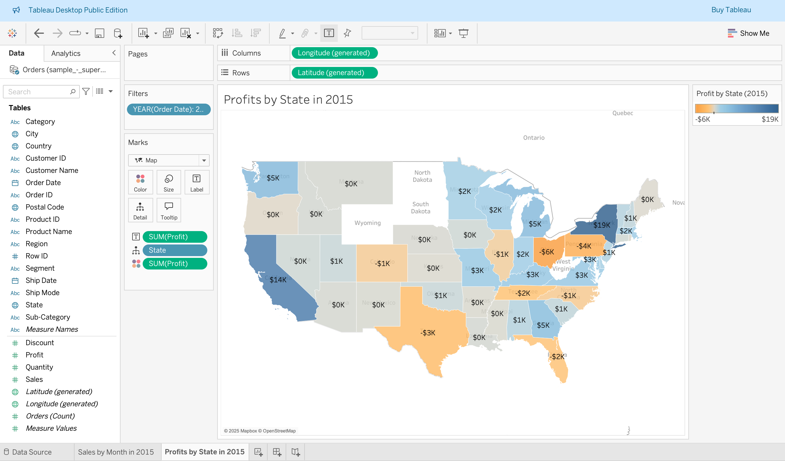In a new sheet, see if you can make the following map, showing profit by state for the year 2015: