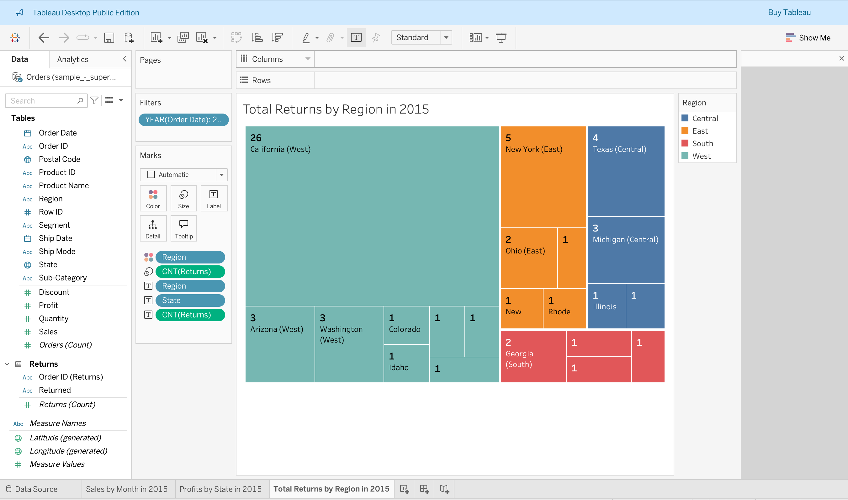 In a new sheet, see if you can make the following visualization, showing returns by region and by state for the year 2015:
