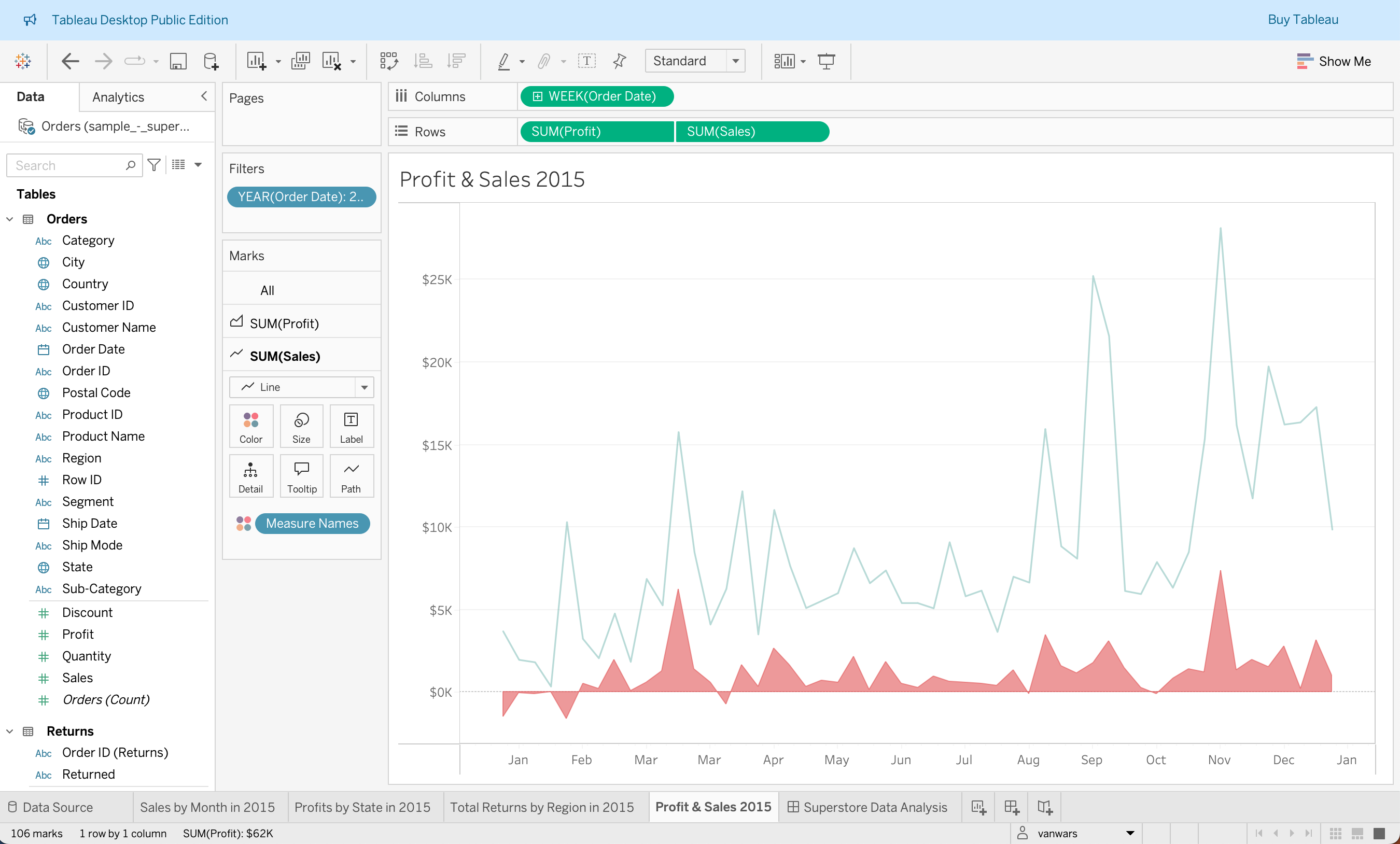 In sheet one, there should be a list of variables that you can use to create your charts. These variables are divided into dimensions and measures. Tableau automatically positions dimensions on the top and measures on the bottom.