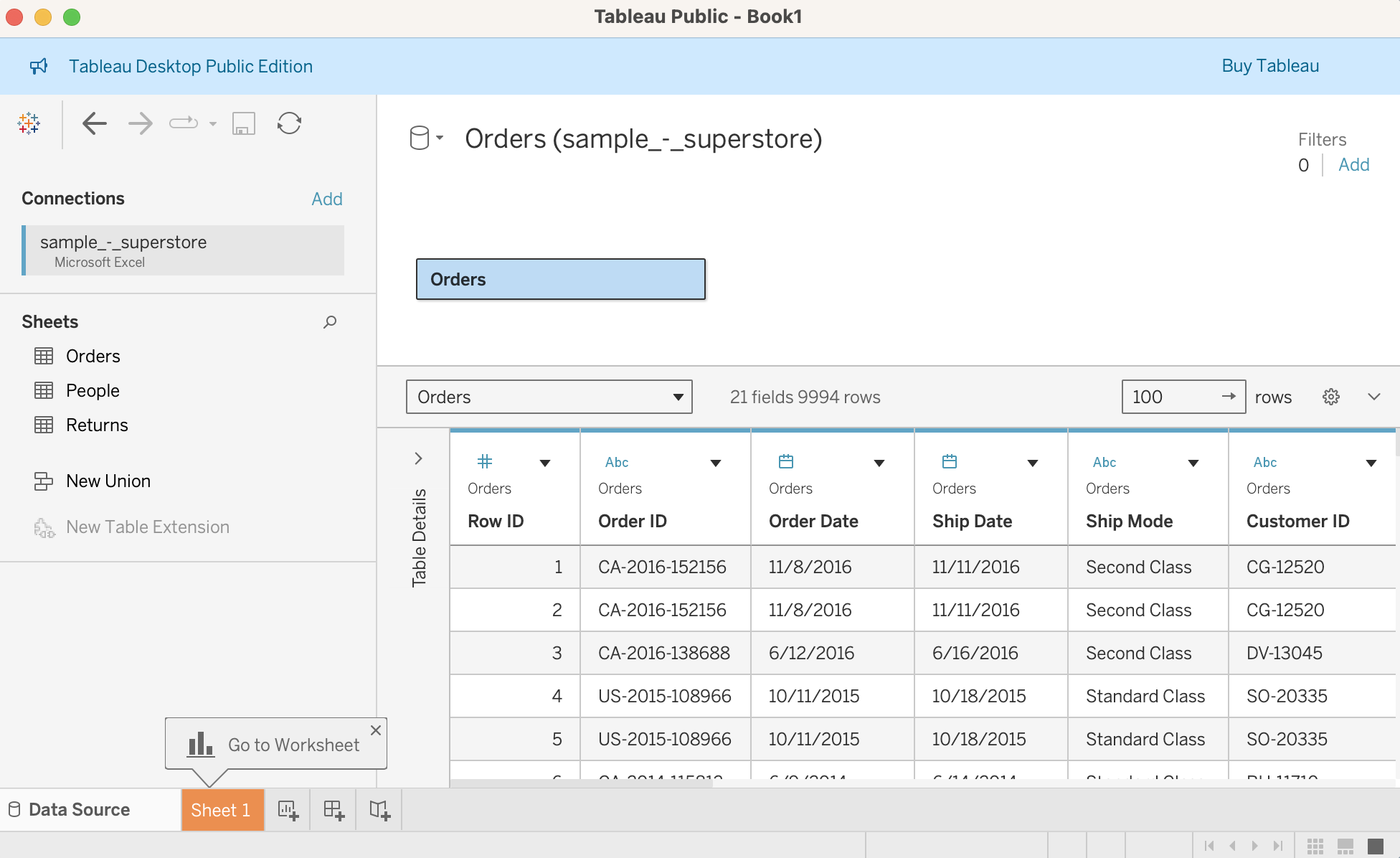 Once loaded, drag the "orders" sheet into the main panel to display the data: