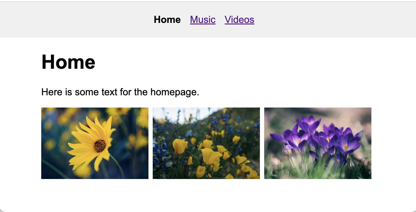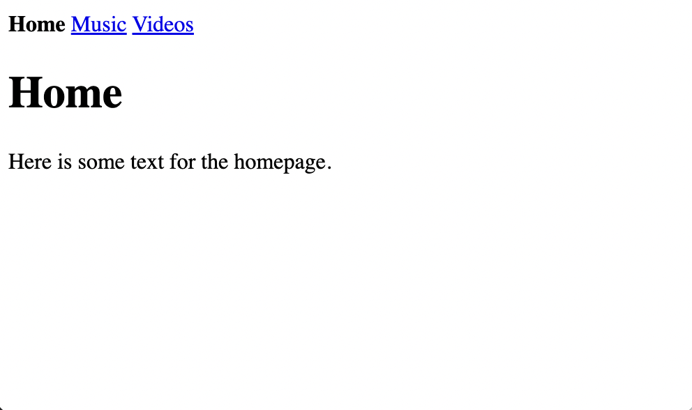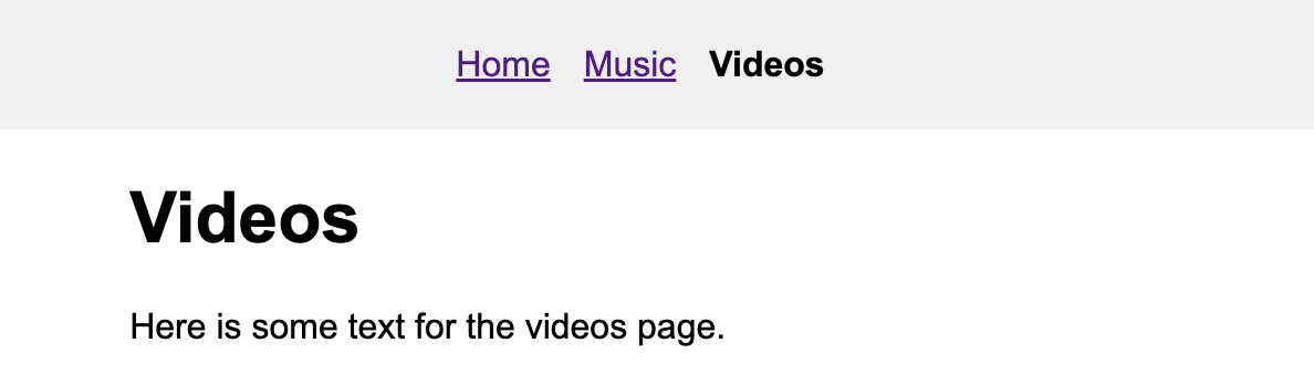 Next, add this same stylesheet link tag inside of the head tag of the videos.html and music.html files, and then preview both of these in your web browser. These pages should look like this: