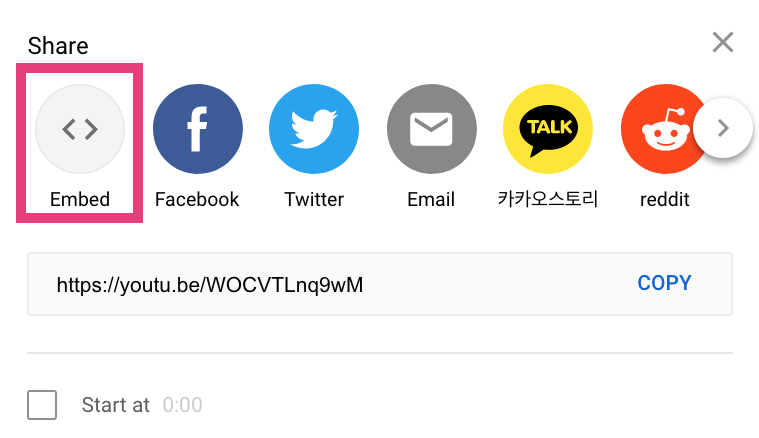 Inside the videos.html file, add two different YouTube or Vimeo videos inside of the <section class="video-section"></section> region of your page. To get the embed code of any YouTube video, (a) navigate to the video, (b) click "share", (c) then click "embed," and (d) then copy the embed code (iframe tag), as pictured below (note the pink squares):