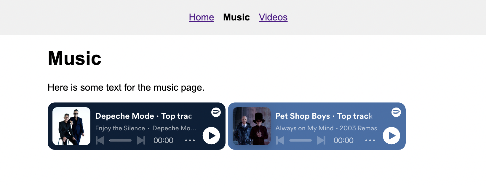 Inside the music.html file, add one or more embedded music players inside of the <section class="music-section"></section> region of your page. There are instructions on how to get the embed code of a Spotify artist profile, album, song, playlist, or podcast on Spotify's documentation page.