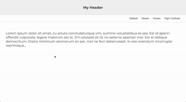 Open styles.css and scroll down to ~line 70. You will see three classes ( ocean, desert, and high-contrast) which correspond to three different themes. If you apply any of these classes to the <body></body> tag and preview your HTML, you will see that the theme changes. Try it out!